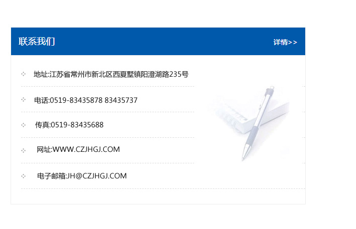 地址:常州市新北區友邦商務大廈1幢16、17層  電話:0519-85101652  傳真:0519-85112595  郵編:213022  網址:www.cz-jiayue_cn.wygdyskz.com  郵箱:xiajifengaa@163.com